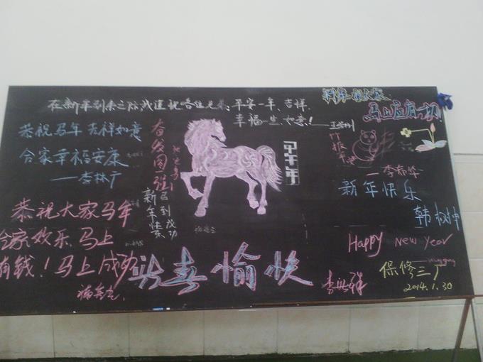 草長鶯飛二月天,拂堤楊柳醉春煙。市公交公司各單位都以不同的形式寄托希望,祝賀新的一年,其中馬年畫馬是一突出的亮點。有的表現為端莊、祥怡;有的疾馳如飛,勢不可擋;有的奮蹄向上、斗志激昂。不同的馬兒表現對公交事業良好的祝愿,也充分體現公交濃厚的企業文化氛圍。市公交公司保修三廠在以馬寓意的同時,邀請職工書寫新年祝語,這不僅抒發了大家的美好祝愿,還增添了文化氣息,更增加了大家的向心力、凝聚力、戰斗力。