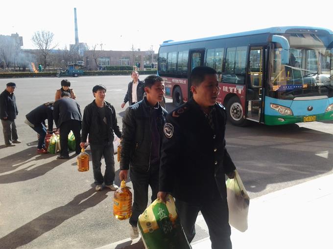 近日,在雷鋒月期間,市公交公司汽車四隊148路、150路文明示范線路部分駕駛員,用他們在公司開展的“文明示范線路”考評中獲得的2000元獎金購買了面粉、大米、食用油、雞蛋等生活必須品,代表車隊全體員工前往東營區辛店街道敬老幸福園,為年邁的老人送上自己的愛心。