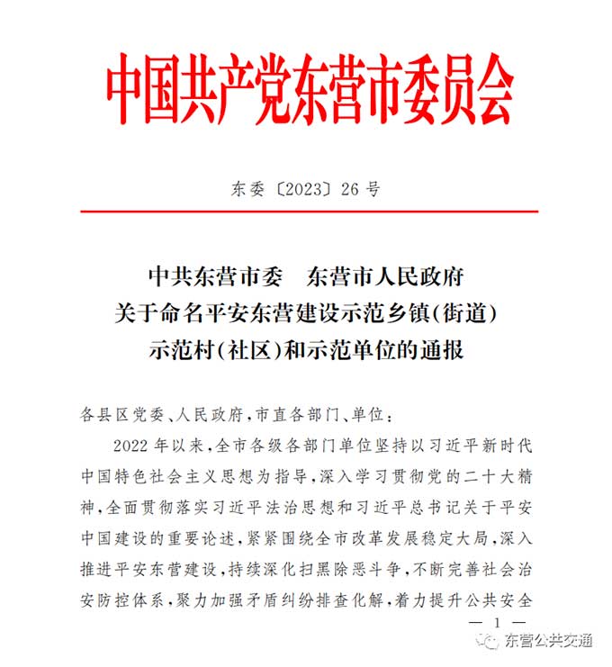 近日,市委市政府聯合印發《關于命名平安東營建設示范鄉鎮(街道)示范村(社區)和示范單位的通報》(東委〔2023〕26號),市公交公司再獲表彰,被市委市政府命名為市級平安交運企業