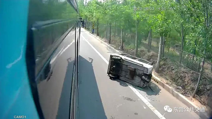 6月23日下午,東營市公交公司汽車四隊(duì)的孫建強(qiáng)師傅正在執(zhí)行26路公交車任務(wù)。兩點(diǎn)五十分左右,車輛沿南一路由東向西行駛至成寨村西側(cè)300米附近時,看到路邊有一輛“老年代步車”已經(jīng)翻倒在地。“當(dāng)時我開的公交車剛剛離開成寨村那一站,我看到前方路邊有一輛三輪車側(cè)翻倒在地上,車周圍沒有人,車前輪子還一直在轉(zhuǎn),看著車?yán)锖孟襁€有人,因?yàn)椴淮_定什么情況,我就趕緊把公交車停靠在路邊的安全位置,跑下去查看。”