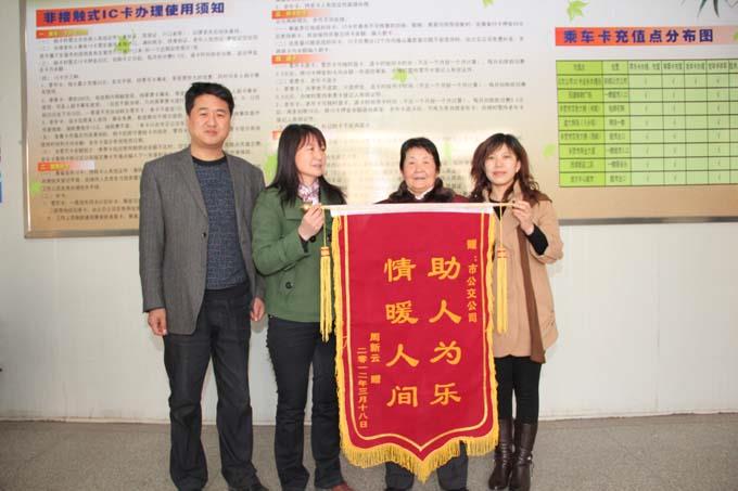 3月20日早上8:30分,一位年邁花甲的周阿姨在家人的陪伴下來到市公交公司信息中心IC卡業務辦理處,送來一面“情暖人間,助人為樂”的錦旗,以此來感謝市公交公司IC卡業務辦理處職工耿瑞華及王海紅尊老愛幼、助人為樂的優良品質。